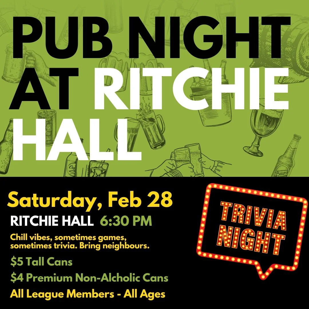 Come down to the Ritchie Hall on the last Saturday of the month for beers, snacks, and music. For Ritchie members and any other community league member, and invited guest!